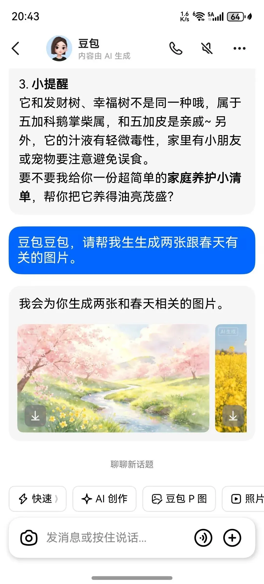 把看到的春天记在心里,再用 AI 生成春日画作,创意无限,每个孩子都是小艺术家。