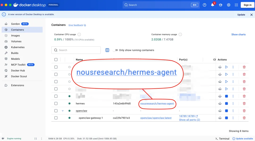 打开Docker Desktop看一眼,会有一个正在运行的container,那就是Hermes Agent的"小屋"。