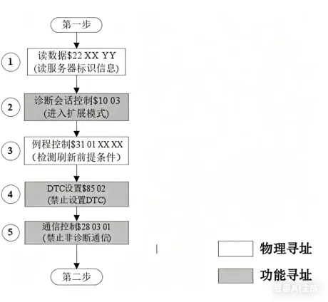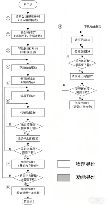 UDS诊断协议(十七)ECU软件刷写流程(更新)之前介绍的ECU软件刷写流程,大家比较关注。今天补充一下流程图和一些具体描述,更新一下。感兴趣的朋友可以收藏转发。ECU刷写流程主要包括预编程步骤、编程步骤、后编程步骤三个部分:预编程步骤,主要用来做软件刷写前的数据通道打通、软件刷写环境的检查和准备;编程步骤,是软件刷写的主要步骤,包含了ECU内存中旧数据的擦除、新软件数据的下载、下载数据的完整性校验;后编程步骤,主要作用是软件刷写完成后车辆状态的恢复,确保整车ECU恢复到正常工作状态。我们以一段实际CAN报文log来详细介绍下整个刷写流程。(本示例为基于内存地址管理的ECU、通过CAN总线刷写、不包含自回滚机制)1、刷写前通过22服务读取ECU的软件版本号、零件号等信息进行状态确认。可选的步骤,根据实际需求来定。2、功能寻址10 03,让整车ECU都进入扩展会话,为后续发送28、85等服务做准备。另外,为了维持ECU的扩展会话,诊断仪需周期发送3E 80,一般2~4秒为周期发送。3、通过31例程服务对被刷写ECU的编程条件进行检查,确保软件刷写过程的安全。具体检查内容自定义,一般包括车速、电压等。4、功能寻址发送85 02,关闭所有ECU的故障码设置功能,防止软件刷写过程中ECU误报故障码。5、功能寻址发送28 03 01,禁用非诊断通信。让CAN总线带宽尽量全部用于诊断刷写,提高刷写速度。编程步骤
