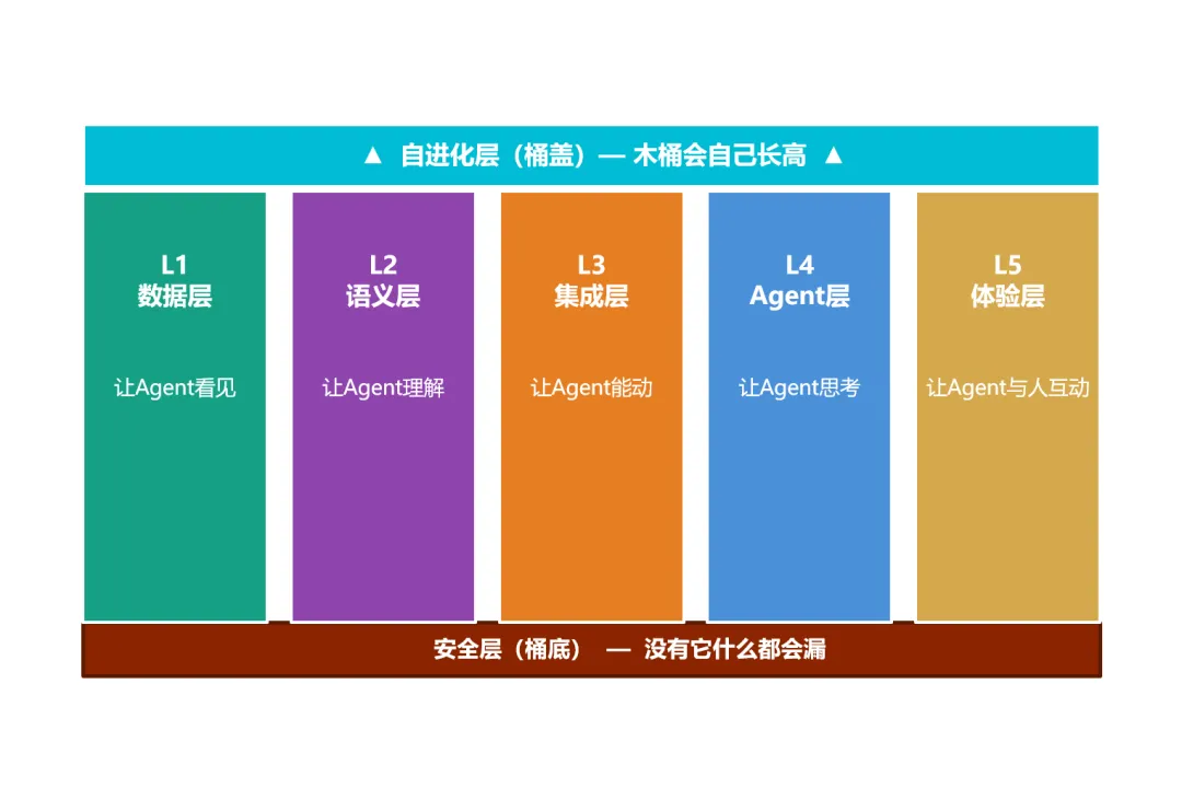 这就是本文要讲的事:企业AI能力的这几层,不是独立可选的模块,而是一个整体。我自己会用一个更精确的模型来描述它——木桶原理。