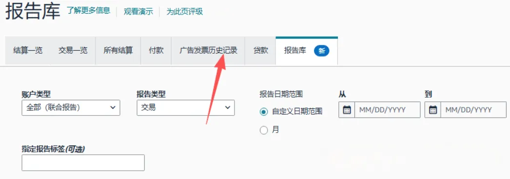 操作路径:卖家平台 > 付款 > 报告库 > 广告费用发票历史,跳转后进入广告后台