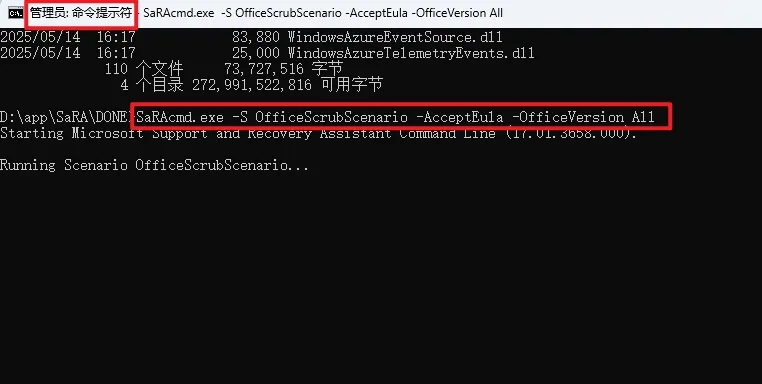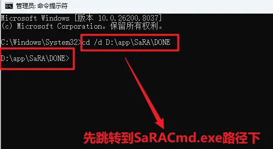 ⚠️ 注意事项 必须使用 管理员权限 CMD,否则会报错:SaRA needs to run elevated