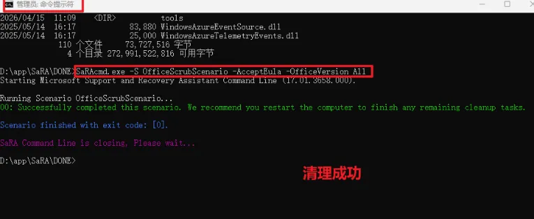 指令成功执行表示:Office 残留已彻底清除,Click-to-Run 已被移除。