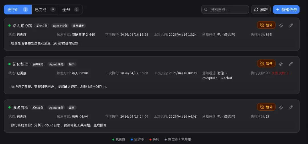✅ 自然语言创建提醒:"明天早上8点提醒我开会"——不需要写Cron ✅ 任务类型区分:reminder(发消息提醒)vs task(AI执行操作) ✅ 多种触发模式:一次性、循环间隔、Cron表达式,灵活选择 ✅ 自动推送到IM:任务结果直接发到你绑定的微信/飞书