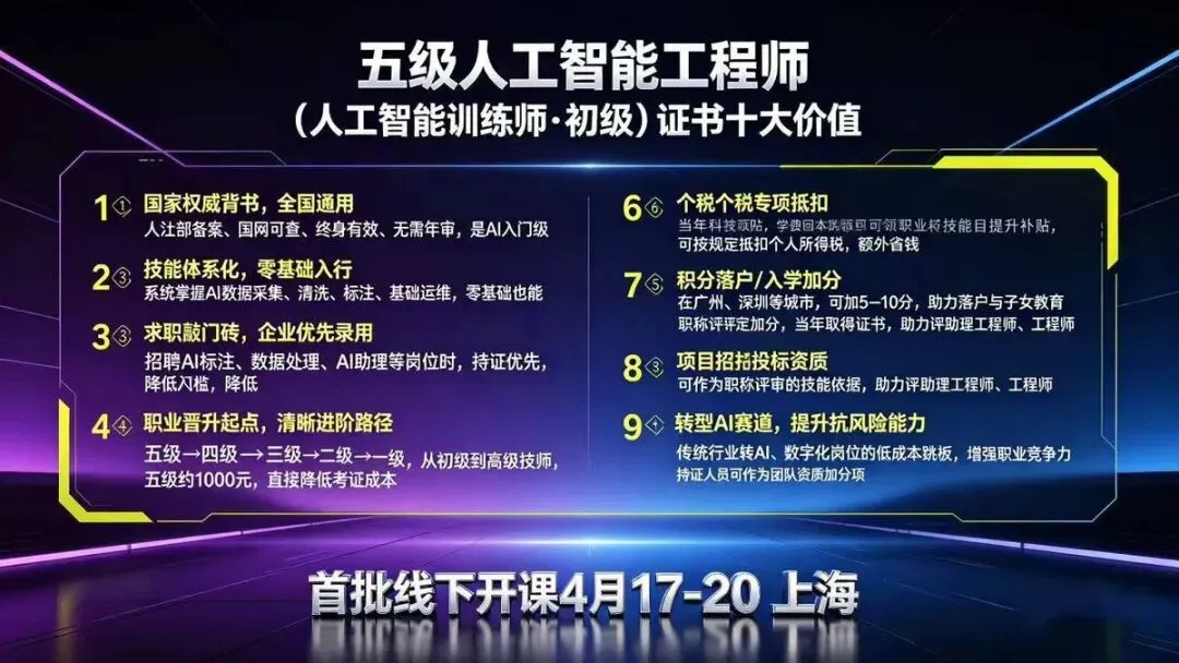 技能提升补贴:上海最高可领 3250元(五级) 个税专项抵扣:拿证当年即可申报 积分落户加分:广州、深圳等城市加5-10分,上海居住证积分也有助力