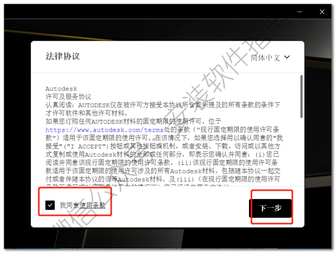 4、勾选我同意使用条款,然后点下一步
