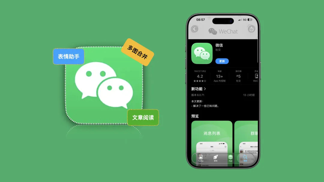 近日,iOS 微信发布了 v8.0.71 正式版本,官网更新文案依旧是 「解决了一些已知问题」。 但实际体验下来,多图合并、公众号文章以及表情助手等功能都改变了不少。