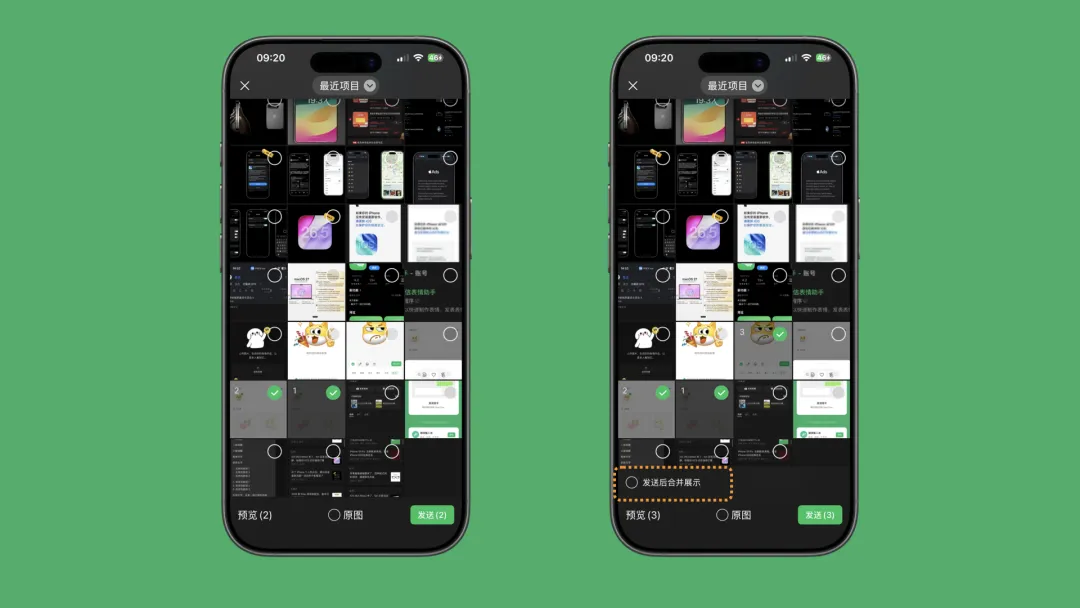 这次最实用的功能就是 「多图合并发送」, 在聊天页面,一次选择 3 张及以上图片时,底部会出现「发送后合并展示」的选项。勾选之后,原本一张张刷屏的图片,会折叠成一张卡片发出去。