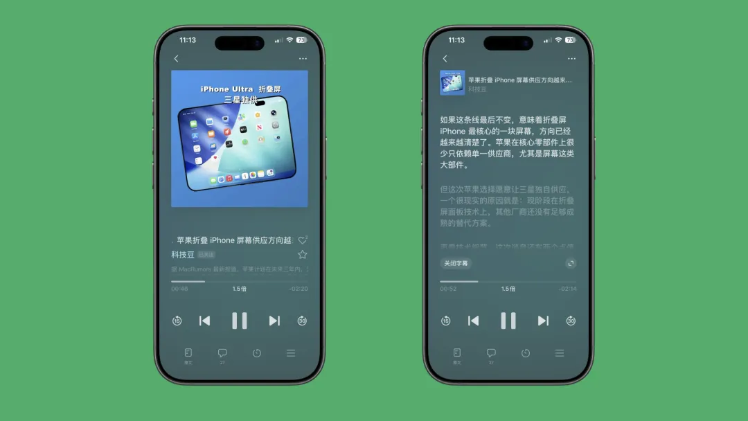 还有一个变化,我觉得不少经常看公众号的人会喜欢,就是「听全文」支持实时滚动字幕了。现在部分 iPhone 用户在播放器界面中,已经能看到同步滚动的字幕内容了,轻点字幕直接展开全文,边听边看方便很多。 以前「听文章」更像是纯后台播放,现在升级为比较实用的阅读辅助功能了。