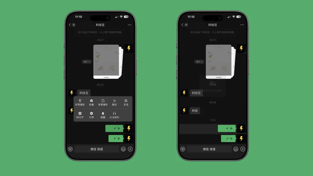 聊天页面的语言支持「从当前听」了。长按语音消息,选择「从当前听」功能,系统会自动从当前这条语音消息开始,向下一条条的朗读,不需要再手动逐条点击,操作更加方便。值得注意的是,支持朗读的消息类型也有所扩展,包括语言消息、表情消息、图片消息等更多内容。