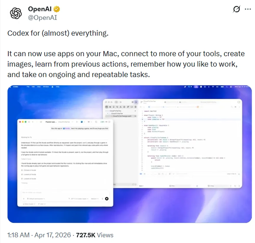 简单来说,就是Codex能自己用光标在你电脑上点来点去、输入内容,你日常用的各类应用它都能适配。