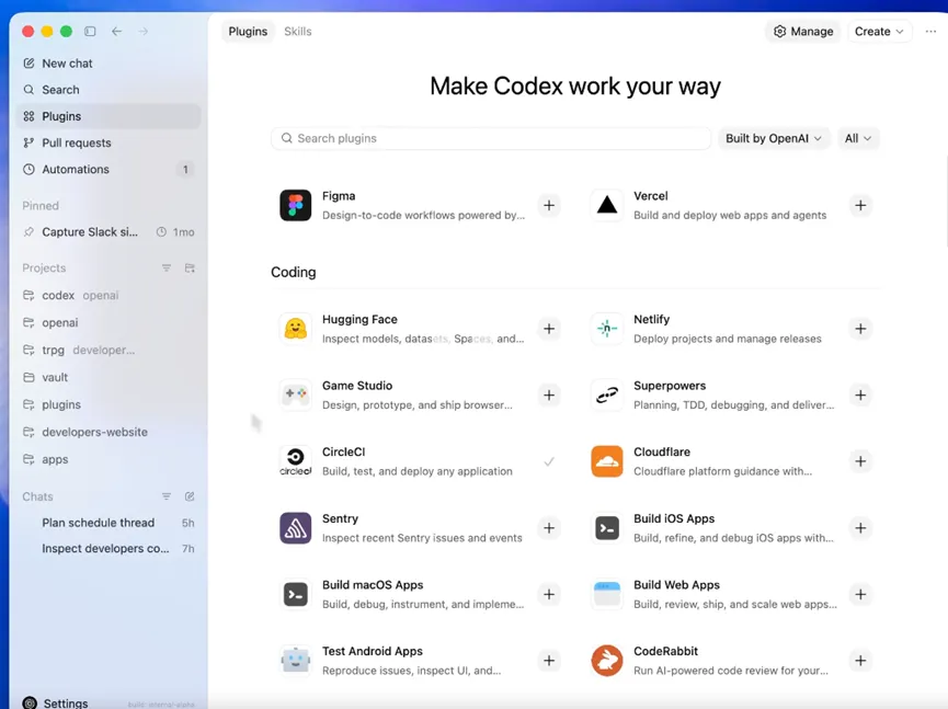 插件生态这块也没落下,一下子更了90多款新插件,把各类技能、应用集成和MCP服务都整合进来了,让Codex能在更多工具里获取信息、执行操作。