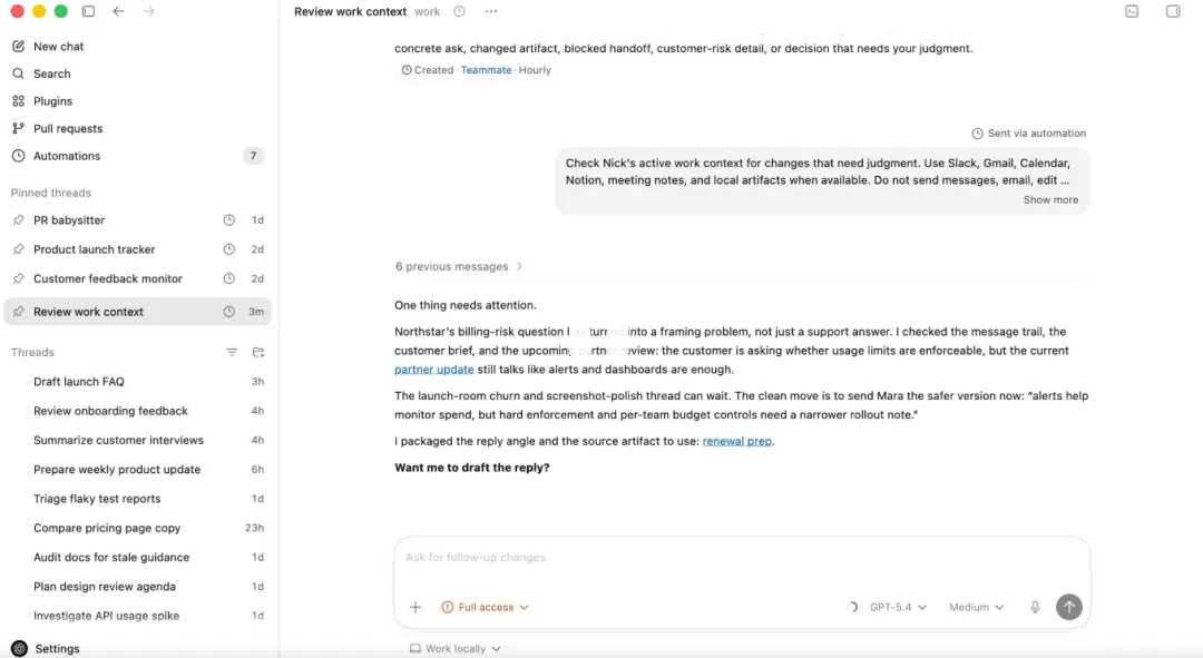 这次更新还把自动化能力做了大幅拓展,最实用的就是能复用历史对话线程,保留之前积累的上下文信息,不用再每次跟它沟通都重新交代背景,尤其是做长期项目,这点能省很多沟通成本。