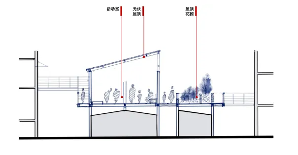 呈现光伏屋顶、生产性景观与休闲空间的互动关系,直观展现清洁能源与日常生活的融合效果,将仓库改造为集能源生产、景观观赏、邻里互动于一体的复合型公共空间。