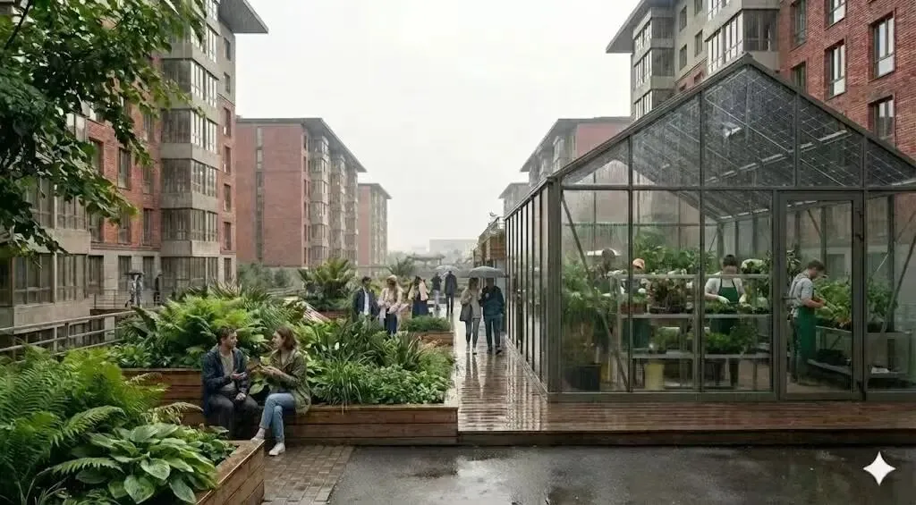 通过AI技术手段还原空间节点细节及植物季相变化,使低碳生态的设计理念转化为可感知的空间体验,让原本闲置的仓库升级为兼具生态效益与社交功能的社区公共客厅。