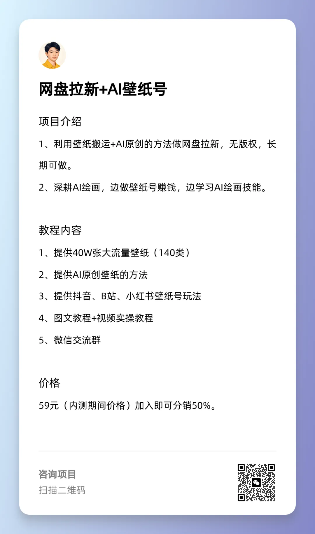 我做了一个网盘拉新加AI壁纸号项目社群目前59元(永久)。如果你想学习AI绘画,或者你想做壁纸号网盘拉新。欢迎加入。