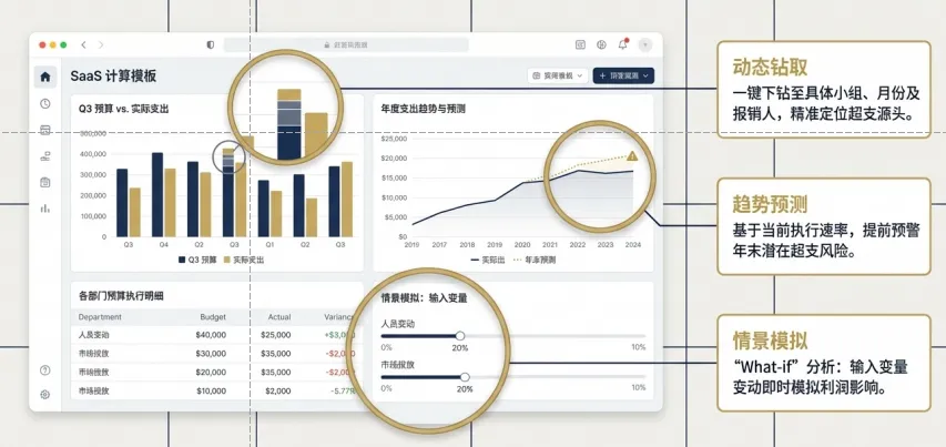一个优秀的看板,绝不是简单的“预算数 vs 实际数”静态表格。它应该是一个交互式工具: