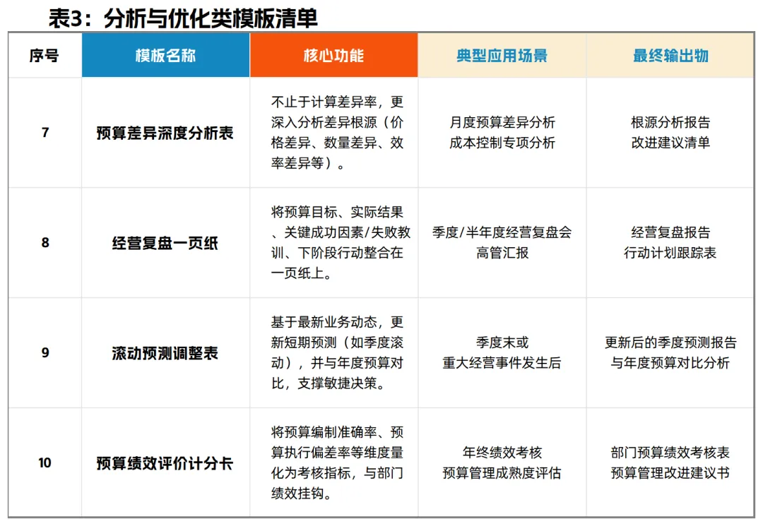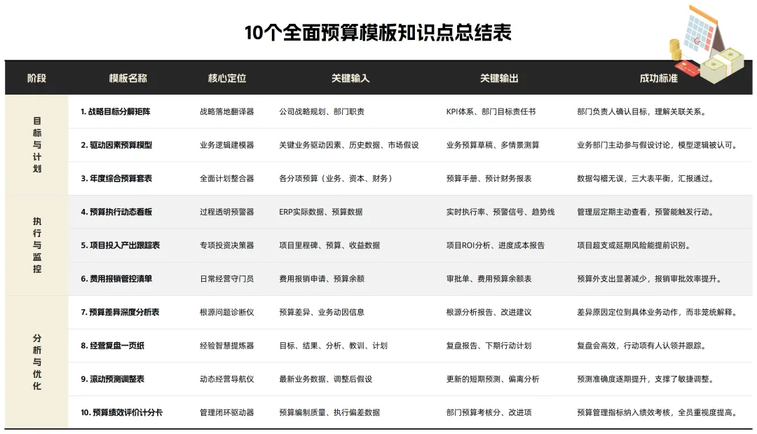 根据预算管理的生命周期,我们将这10个模板划分为“目标与计划”、“执行与监控”、“分析与优化”三大阶段。每个模板都承载着特定的使命,解决着特定场景下的痛点。