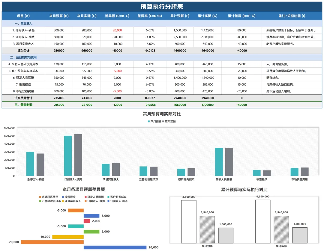为了让理论落地,我们以游牧科技为例,展示一个核心模板——月度损益预算与实际对比表(模板4的细化)的设计与应用。
