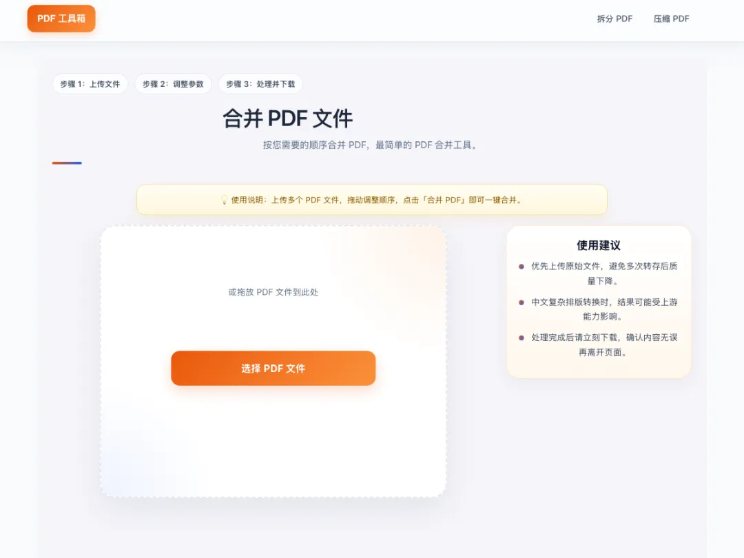 合并PDF — 多个文件合为一个,拖拽排序,秒级完成拆分PDF — 按页码范围拆分,想拆哪页拆哪页压缩PDF — 体积大幅缩小,质量几乎无损提取页面 — 从PDF中精准提取指定页面