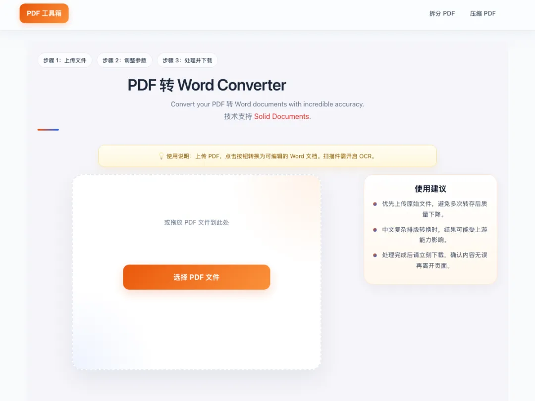 不是"免费试用3次"的套路,没有隐形收费,没有水印。上传文件,选操作,下载结果,不需要看教程。文件本地处理,不上传到第三方服务器。电脑手机平板,浏览器打开就能用。