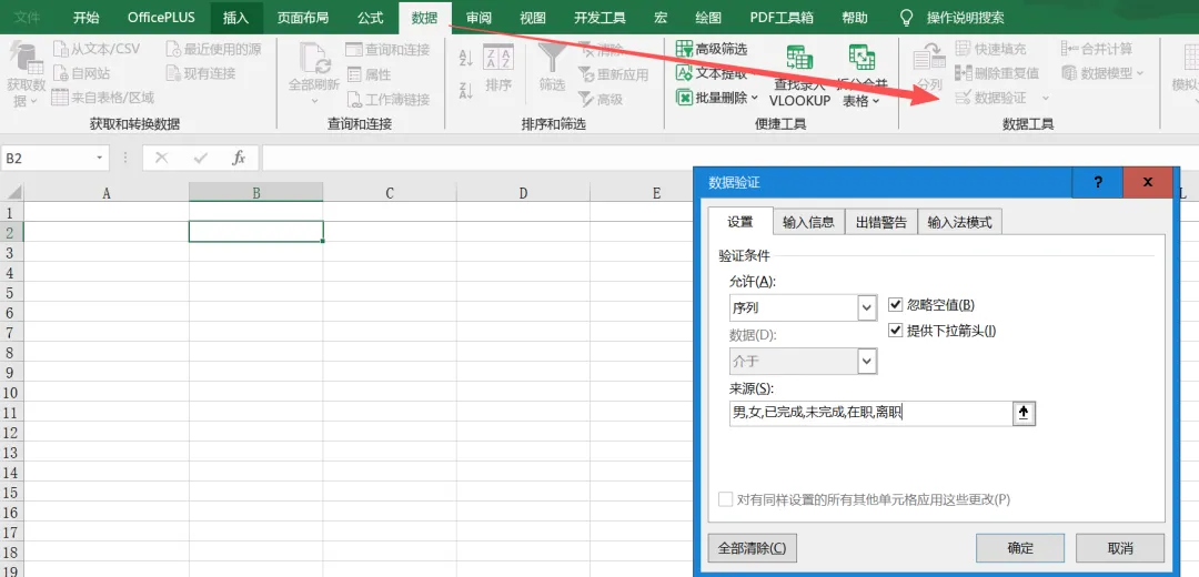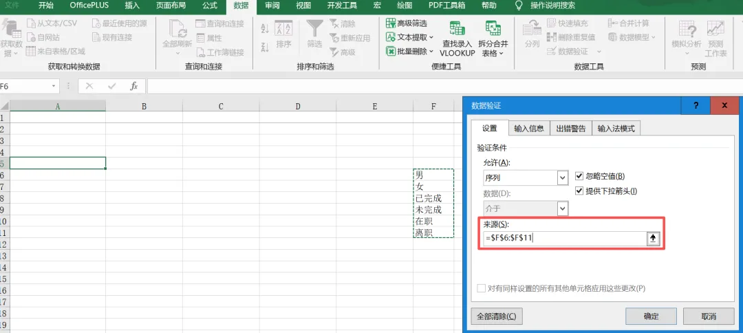 操作路径:选中单元格区域 → 顶部【数据】→【数据验证】→ 允许选择「序列」填写来源内容,用英文逗号隔开:男,女,已完成,未完成,在职,离职