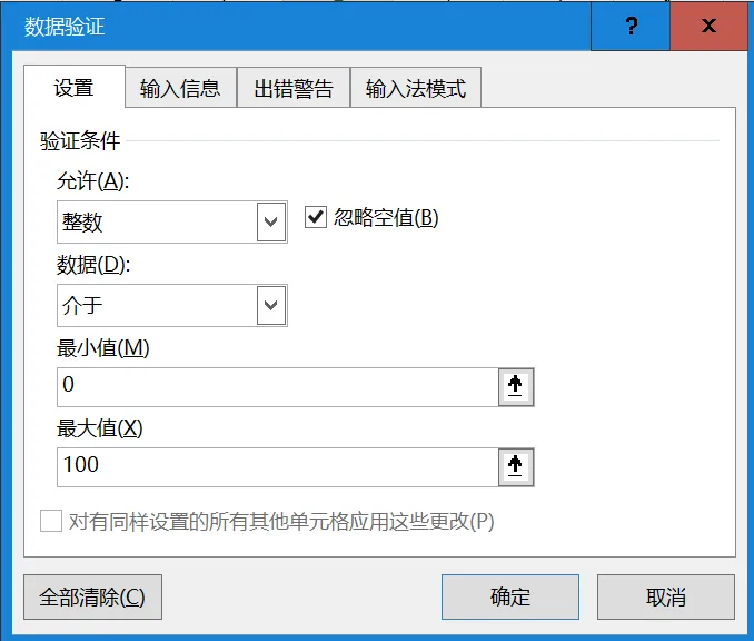 成绩设置 0~100、销量与金额设置最小值 0作用:杜绝负数成绩、不合理数值、超额错误录入。