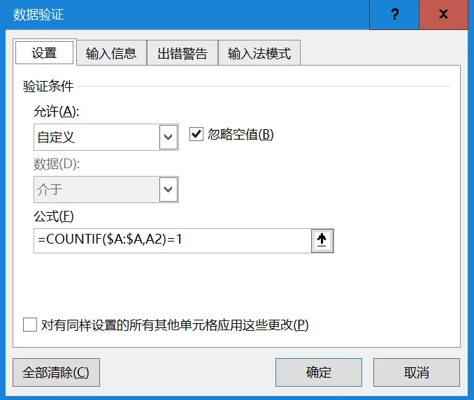 切换到自定义公式,输入:=COUNTIF($A:$A,A2)=1