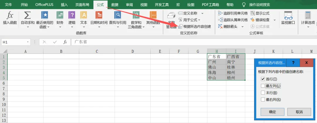 选中所有二级数据区域(含列头,例 H1:I5)。 公式 → 定义的名称 → 根据所选内容创建(或按 Ctrl+Shift+F3)。 勾选 “首行”,取消其他,确定。 (可选)检查:公式 → 名称管理器,确认每个名称的引用位置正确。