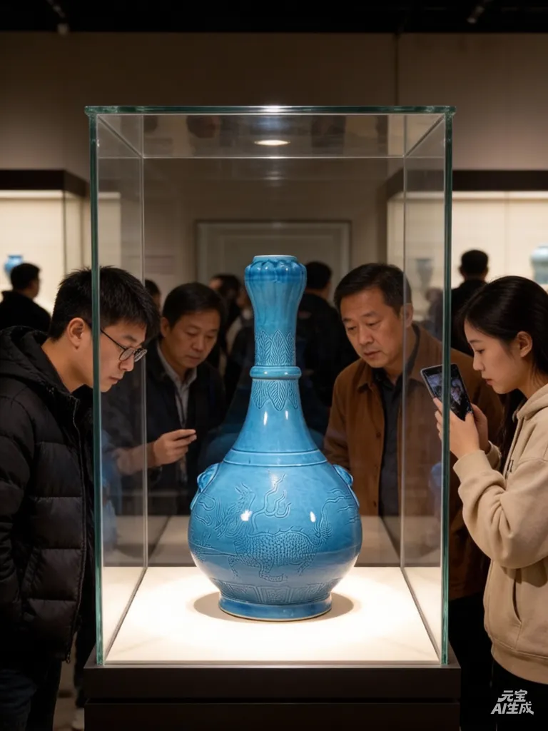 四、市场评估与收藏价值(一)市场定位明代弘治官窑孔雀蓝釉暗刻麒麟纹蒜头瓶为明代单色釉瓷巅峰之作,存世量极为稀少,是收藏界顶级国宝级标的。同类尺寸、同题材弘治官窑孔雀蓝釉瓶,近年拍卖(苏富比、佳士得、中国嘉德)成交价格集中在1500 万 - 3000 万元人民币(含佣金),精品(款识清晰、工艺精湛、品相完美)价格可达 3000 万元以上,同类明代官窑重器拍卖成交价可突破5000 万元。 (二)收藏价值- 工艺价值集孔雀蓝釉、暗刻工艺、精湛制胎三大明代官窑顶尖工艺于一体,是明代单色釉瓷 “形、神、色、工” 完美统一的典范,研究价值极高,为弘治单色釉的核心代表器物。