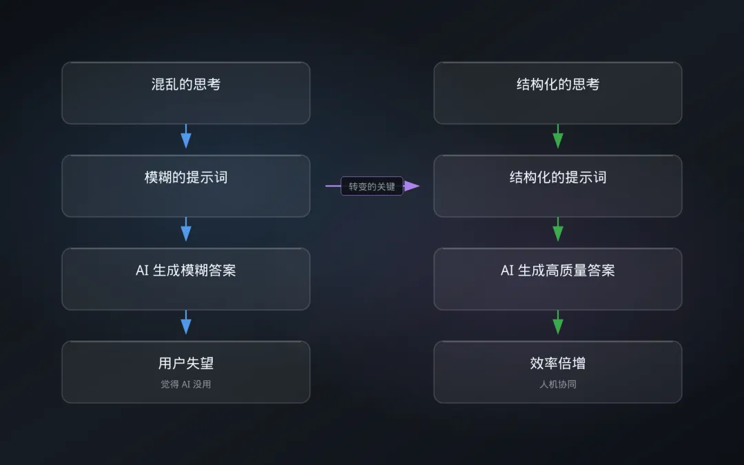 这种模糊的提问,换来的往往是模糊的答案。问题的本质在于:你输入的提示词(Prompt),本质上是你思考过程的"外部化"。如果你的思考本身就是混乱的,AI 只能放大这种混乱。