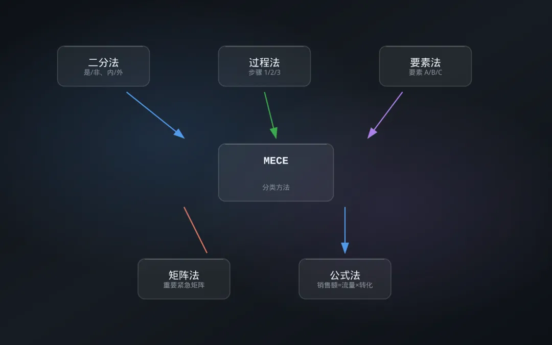 二分法:A / 非 A(是/否、内/外、线上/线下) 过程法:步骤一、步骤二、步骤三(按时间或流程划分) 要素法:组成要素 A、组成要素 B(按构成部分划分) 矩阵法:重要且紧急、重要不紧急、不重要但紧急、不重要不紧急 公式法:销售额 = 流量 × 转化率 × 客单价(按公式拆解)