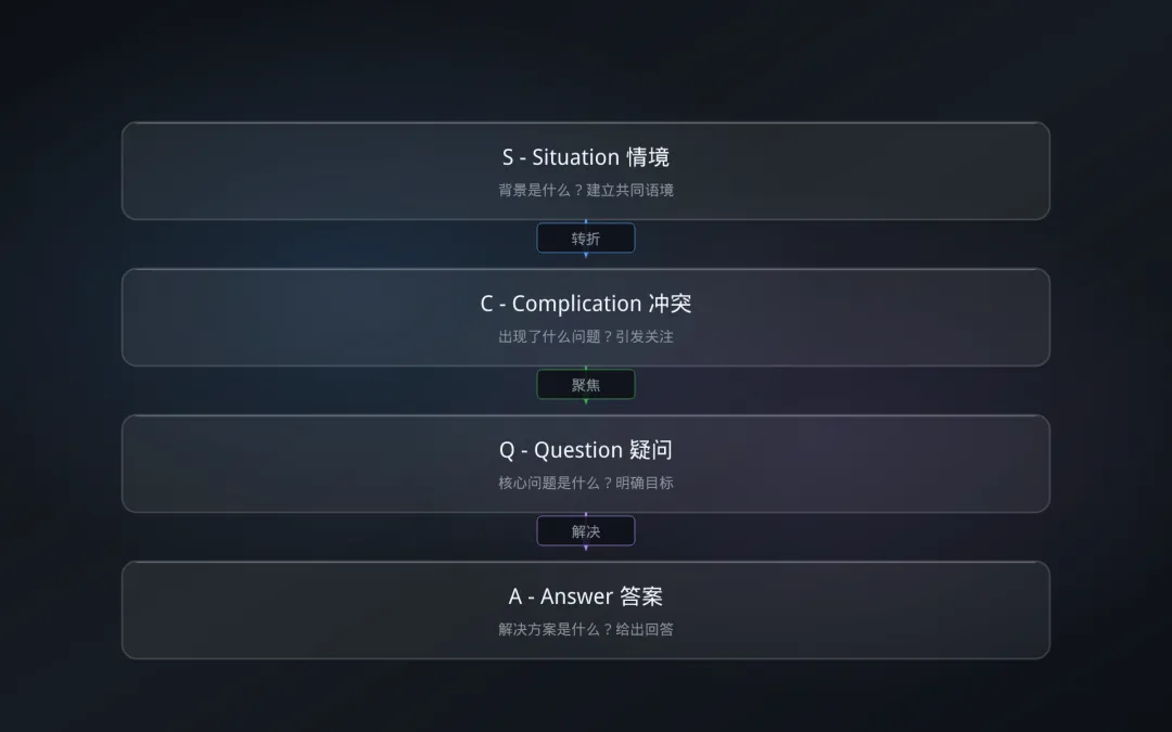 S - Situation(情境):背景是什么?建立共同语境。 C - Complication(冲突):出现了什么问题或挑战?引发关注。 Q - Question(疑问):面对冲突,核心问题是什么? A - Answer(答案):解决方案是什么?给出明确回答。