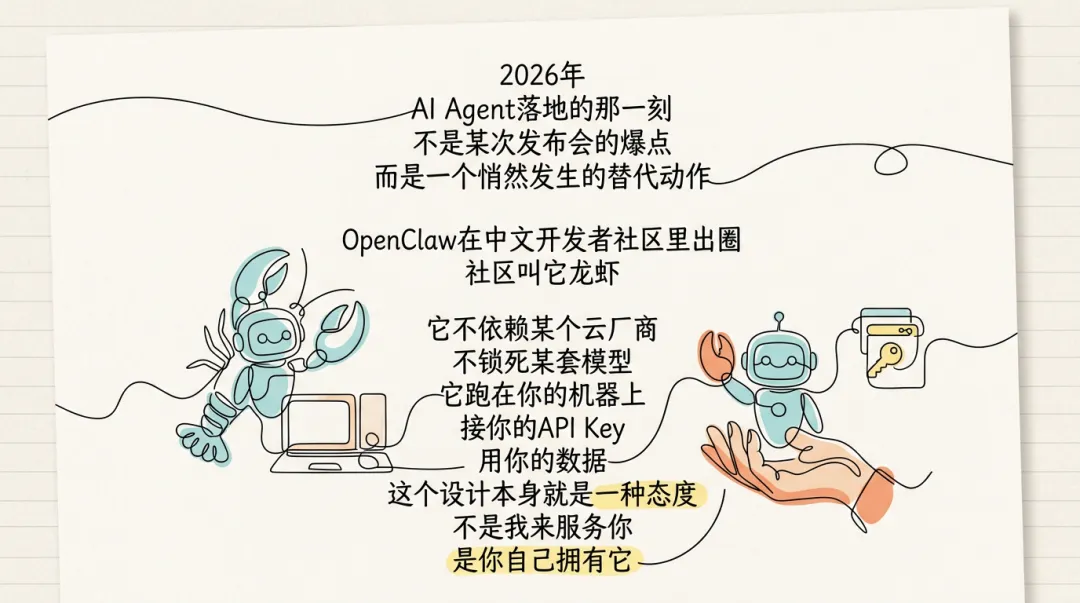 OpenClaw 在中文开发者社区里出圈,社区叫它"龙虾"。它不依赖某个云厂商,不锁死某套模型——它跑在你的机器上,接你的 API Key,用你的数据。这个设计本身就是一种态度:不是"我来服务你",是"你自己拥有它"。