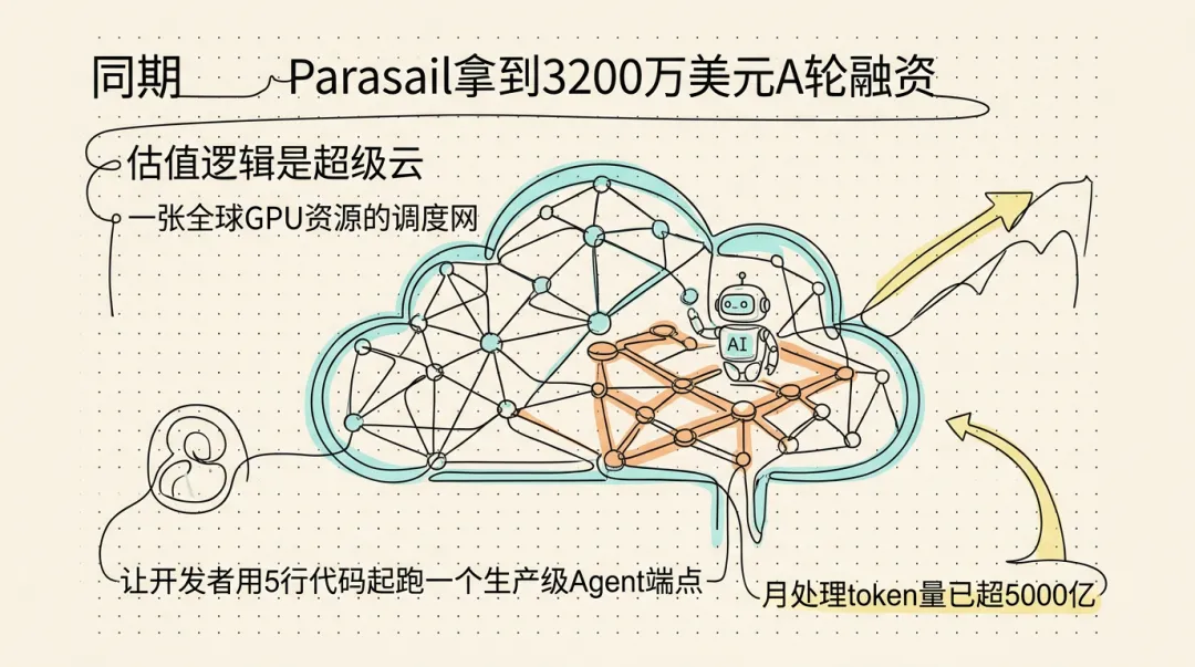 同期,Parasail 拿到 3200 万美元 A 轮融资,估值逻辑是"超级云"——一张全球 GPU 资源的调度网,让开发者用 5 行代码起跑一个生产级 Agent 端点,月处理 token 量已超 5000 亿。