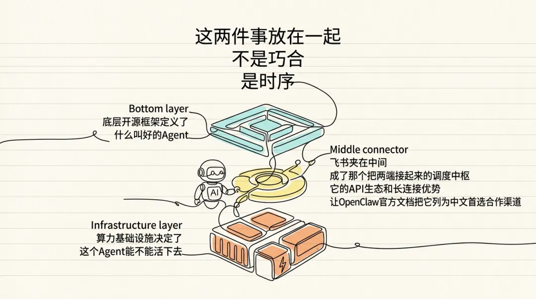 这两件事放在一起,不是巧合,是时序。底层开源框架定义了"什么叫好的 Agent",算力基础设施决定了"这个 Agent 能不能活下去"。飞书夹在中间,成了那个把两端接起来的调度中枢——它的 API 生态和长连接优势,让 OpenClaw 官方文档把它列为中文首选合作渠道。