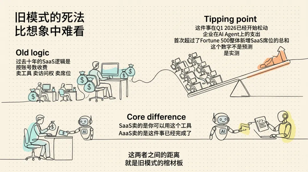 SaaS 卖的是"你可以用这个工具",AaaS 卖的是"这件事已经完成了"。这两者之间的距离,就是旧模式的棺材板。