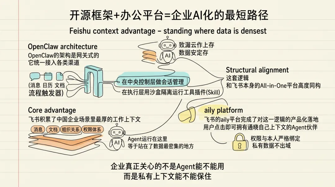飞书积累了中国企业场景里最厚的工作上下文——消息、文档、组织关系、权限体系,Agent 运行在这里,等于站在了数据最密集的地方。