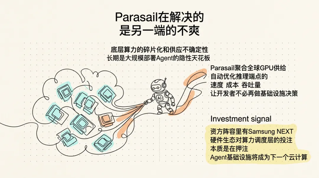 底层算力的碎片化和供应不确定性,长期是大规模部署 Agent 的隐性天花板。Parasail 聚合全球 GPU 供给,自动优化推理端点的速度、成本、吞吐量,让开发者不必再做基础设施决策。资方阵容里有 Samsung NEXT——硬件生态对算力调度层的投注,本质是在押注"Agent 基础设施将成为下一个云计算"。