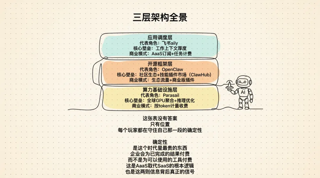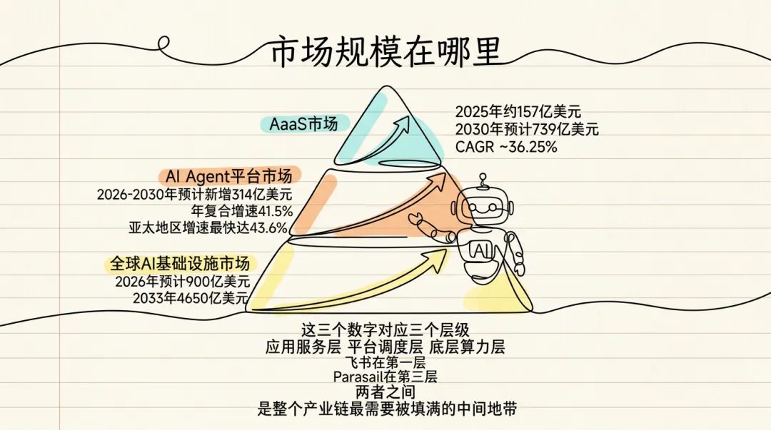 这三个数字对应三个层级:应用服务层、平台调度层、底层算力层。飞书在第一层,Parasail 在第三层。两者之间,是整个产业链最需要被填满的中间地带。