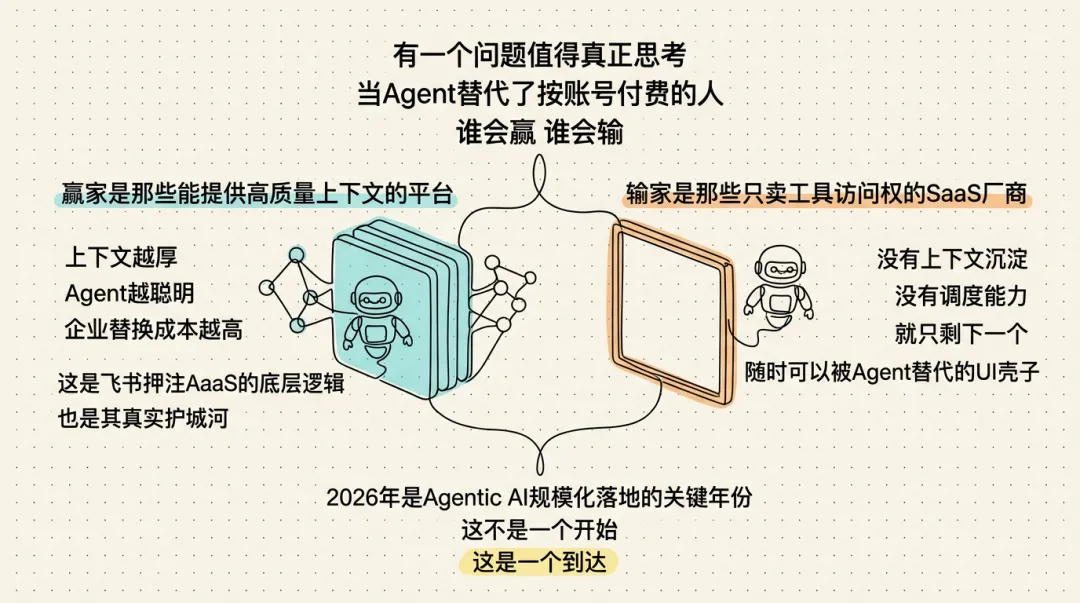 赢家是那些能提供"高质量上下文"的平台。上下文越厚,Agent 越聪明,企业替换成本越高——这是飞书押注 AaaS 的底层逻辑,也是其真实护城河。