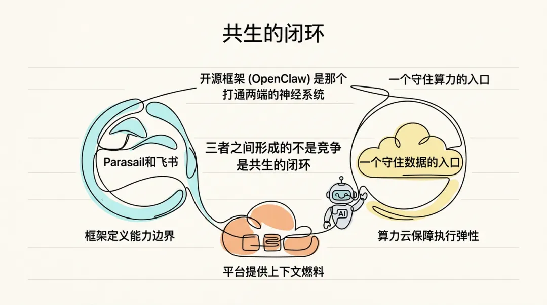Parasail 和飞书,一个守住算力的入口,一个守住数据的入口。开源框架(OpenClaw)是那个打通两端的神经系统。三者之间形成的不是竞争,是共生的闭环——