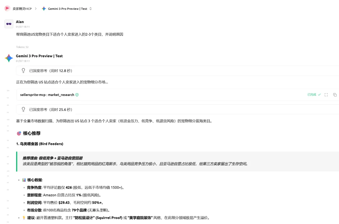 直到我用了卖家精灵 MCP,才知道什么叫真正用在刀刃上的 AI 运营工具!人家是真把 AI 和亚马逊真实数据打通了,不是空架子。就这个蜂鸟喂食器,ASIN 输进去,一键就出深度分析,从产品详情、优惠趋势、销量预测,到 BSR 实时监测,竞品竞争力一眼看透。选品类目分析直接帮我精准定位市场机会,关键词反查、拓展、挖掘一条龙,连流量来源、关联流量都算得明明白白,ABA 数据和谷歌趋势直接同步。我靠它调整了关键词和广告策略,一周内自然流量涨了 32%,ACOS 直接降了 8 个点!