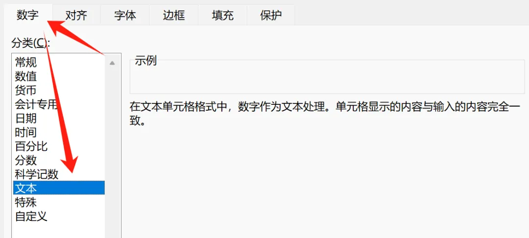 选中单元格 → 按Ctrl+1 → 点「文本」→ 确定