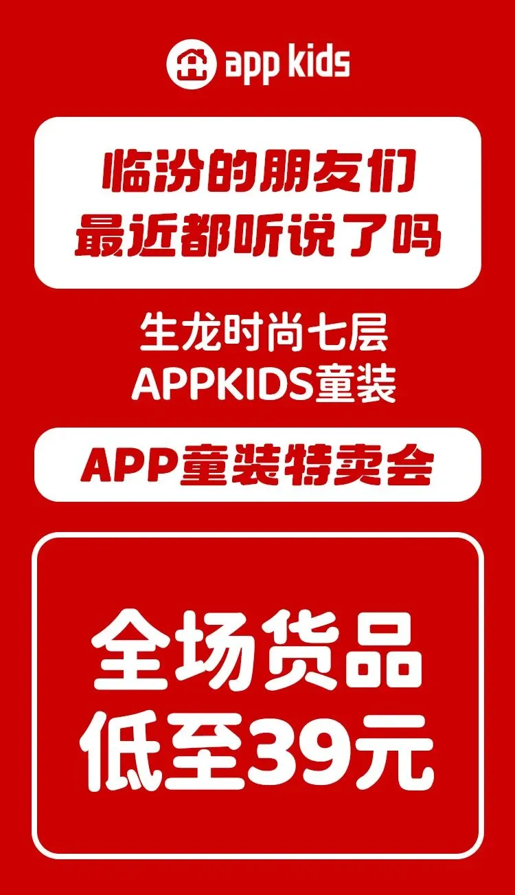 【生龙时尚广场7F】APP kids | 如果您这几天在临汾的话!这个事你务必要注意!*温馨提示为向您提供更丰富的产品资讯,本页面展示素材均由品牌方授权发布。若内容涉及版权疑问,请与我们联系,我们将第一时间协助处理。