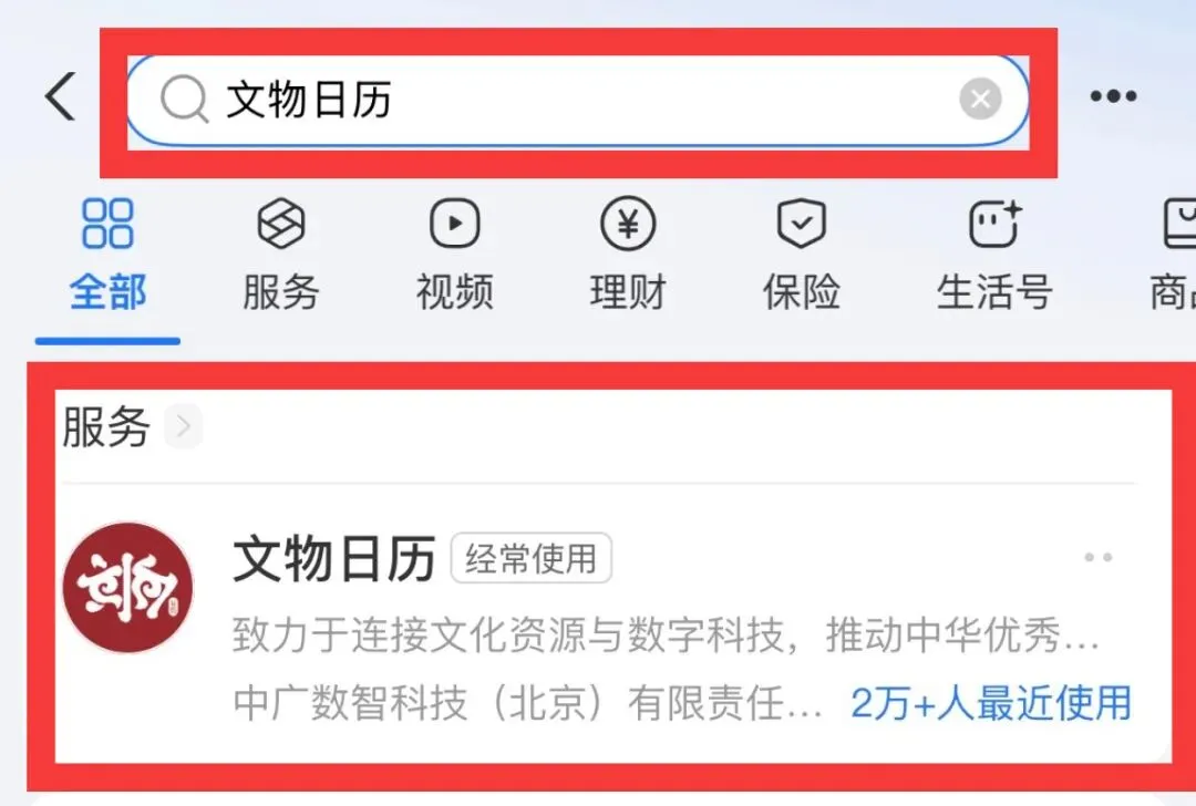 1、打开支付宝APP在主页搜索“文物日历”点击搜索进入进入过后点下面“文物日历”进入