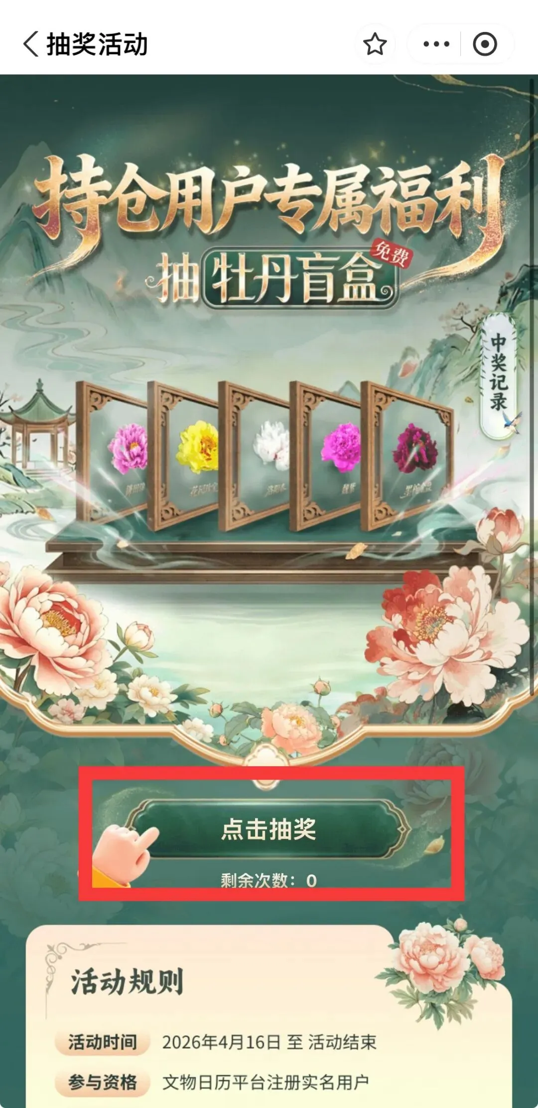 3、进入过后找到“点击抽奖”点击进入就能抽《天香洛城 五彩牡丹》盲盒了
