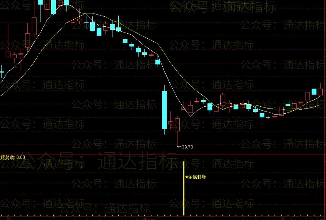 金底封喉:REF(COUNT(EVERY(C< REF(MIN(C,OPEN),1),3),10),0)>=3 AND CROSS(C,MA(C,5)) AND ATAN((MA(C,5)/REF(MA(C,5),1)-1)*100)*180/3.142< -40 AND CLOSE>O AND CLOSE>REF(CLOSE,1) AND TDZB8>3,STICK,LINETHICK3,COLORYELLOW;