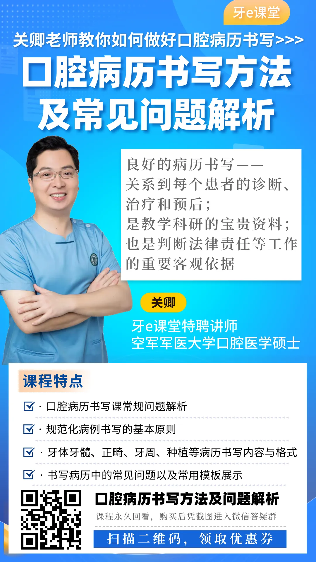 那么,作为口腔医生,该如何进行病历书写才能避免上述问题呢?在书写过程中,要注意哪些细节呢?我们邀请西安空军军医大学口腔医院口腔医学硕士——关卿老师来给大家讲解——
