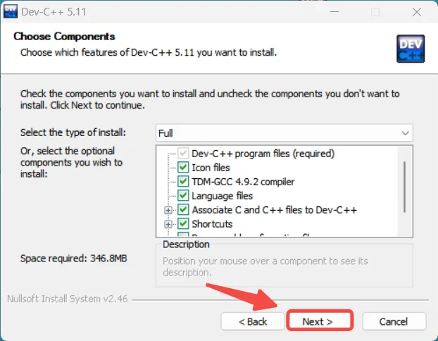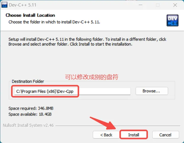 默认安装位置在C盘,如果想装在别处是可以修改的(建议不动,防止出现检测不到配置文件路径的可能,而且DevC++本身也很小)。